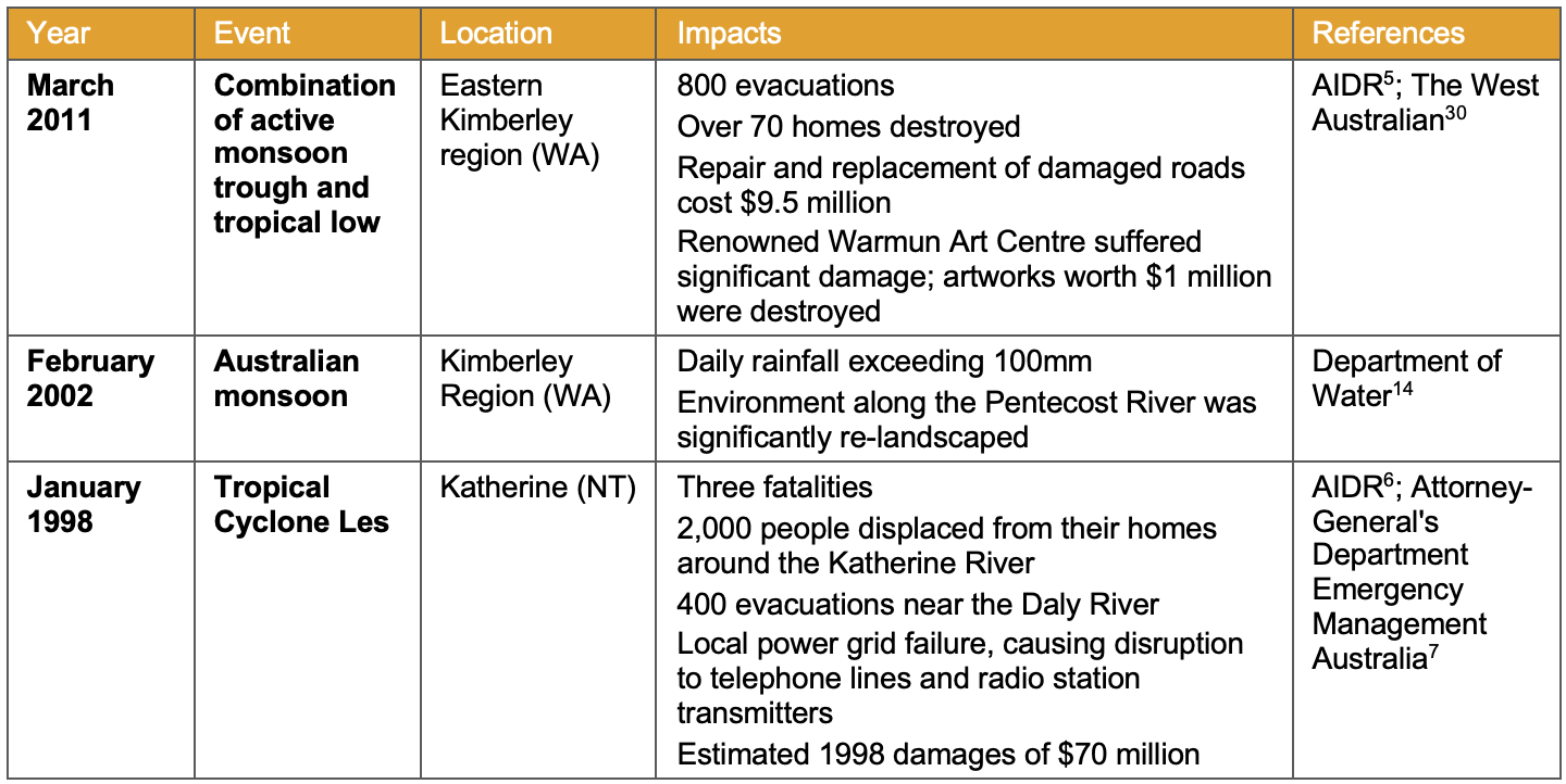 According to a report published by the Water and Rivers Commission in 2000 (31), the average annual flood damage cost for Australia is AUD $350 million, of which $17 million (5%) comes from WA. Insurance industry analysis by McBride (20) discovered that tropical cyclone activity (which includes both flood and wind perils) results in direct economic losses between AUD $40-100 million every year in WA. Table 1 lists the major impacts from three notable historical flood events across WA and NT caused by tropical cyclones and monsoonal rains.